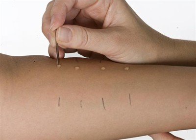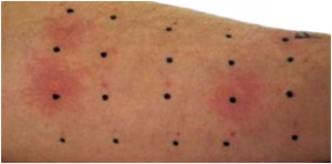 Deri prik testi: Bu testler genellikle ön kol iç yüzüne, bazen de sırt bölgesine deri yüzeyine uygulanır. Deri yüzeyi alkollü bir pamukla silindikten sonra allerjenlerin damlatılacağı yerler kalemle işaretlenir (Resim-2).