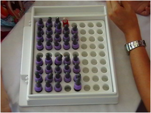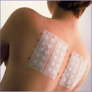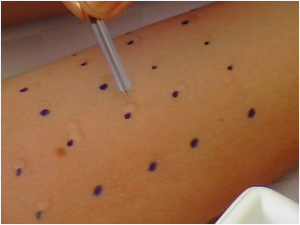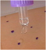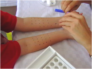 Özel damlalıklı şişelerden alınan allerjenler belli bir sırayla işaretlenmiş olan yerlere damlatılır (Resim-3). Daha sonra steril bir iğne veya lansetle allerjenin damlatıldığı yerdeki deri yüzeyi kanatılmadan hafifçe çizilir (Resim-4).
