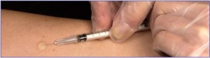 İntradermal test: Küçük bir miktardaki allerjen bir enjektörle genellikle üst kol bölgesine deri içine verilerek uygulanır (Resim-6). Prik testten daha duyarlı bir testtir. Prik testin net bir sonuç vermediği durumlarda yapılmasına allerji uzmanınız karar verir.