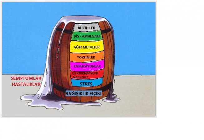 “BAĞIŞIKLIK FIÇISI” elbette bir benzetme. Vücudumuz kendine zarar veren faktörleri temizlemek için bağışıklık sistemini kullanır. Bir çöp kovası gibidir bağışıklık sistemi. Tüm zararlı etkenler bu fıçıya atılır. Zaman zaman atılım organları ile biraz boşaltılıp yer açılır. Ancak fıçının kapasitesi sonsuz değildir, zamanla ağzına kadar dolar, taşmaya başlar, hele ki hoyrat kullanıyorsak. Fıçıya attıklarımız çok, fıçıyı boşaltma sıklığımız az ise kısa sürede kapasitesi aşılır. Sonuç “ HASTALIK”tır. Hangi hastalığın ortaya çıkacağını, nasıl hastalık bulguları göstereceğimizi belirleyen de genlerimizdir.